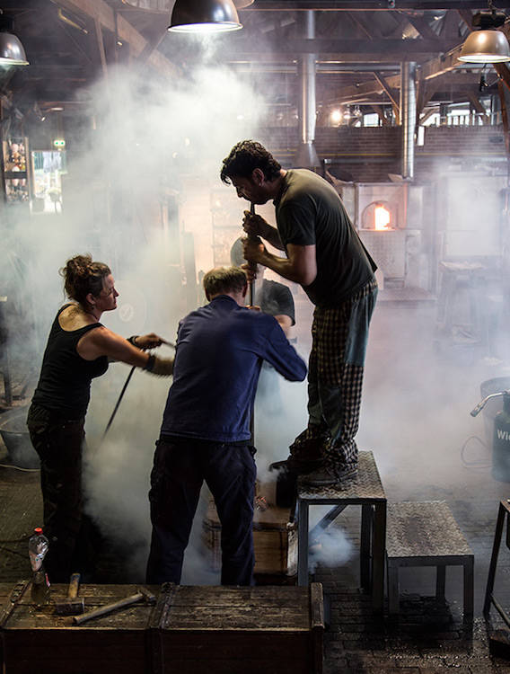 Wie werden mundgeblasene Art-Deco-Lampen von Art Deco Trade hergestellt? Zunächst benötigt man natürlich die drei berühmten Bestandteile: Sand, Soda und Kalk. Diese Bestandteile werden in einem Ofen bei 2300 °C erhitzt. Dadurch entsteht dichtes, flüssiges Glas. Wenn das flüssige Glas eine Temperatur von 1130 °C erreicht, wird das Glas mit einem Stahlrohr aus dem Kessel genommen. Um die Lampenschirme aus Glas zu formen, wird eine Gussform aus Birnbaumholz genutzt. Es gibt verschiedene Arten von Gussformen, wie die Vielfalt der Lampen zeigt, die Art Deco Trade anbietet. Das von der Röhre des Glasbläsers hängende Glas wird in der Form gestaltet. Durch die Röhre wird Luft geblasen, wodurch das flüssige Glas sich ausweitet. Während die Röhre gedreht wird, nimmt das Glas die Form der Gussform an. Der Glas-Lampenschirm wird dann von der Röhre getrennt und in einen Ofen gelegt. Darin wird das Objekt ungefähr 24 Stunden lang abgekühlt, damit es nicht aufgrund von Temperaturspannung bricht. Schließlich wird der Hals auf der richtigen Höhe abgesägt und das Glas poliert, was der Lampe eine schöne Oberfläche verleiht.