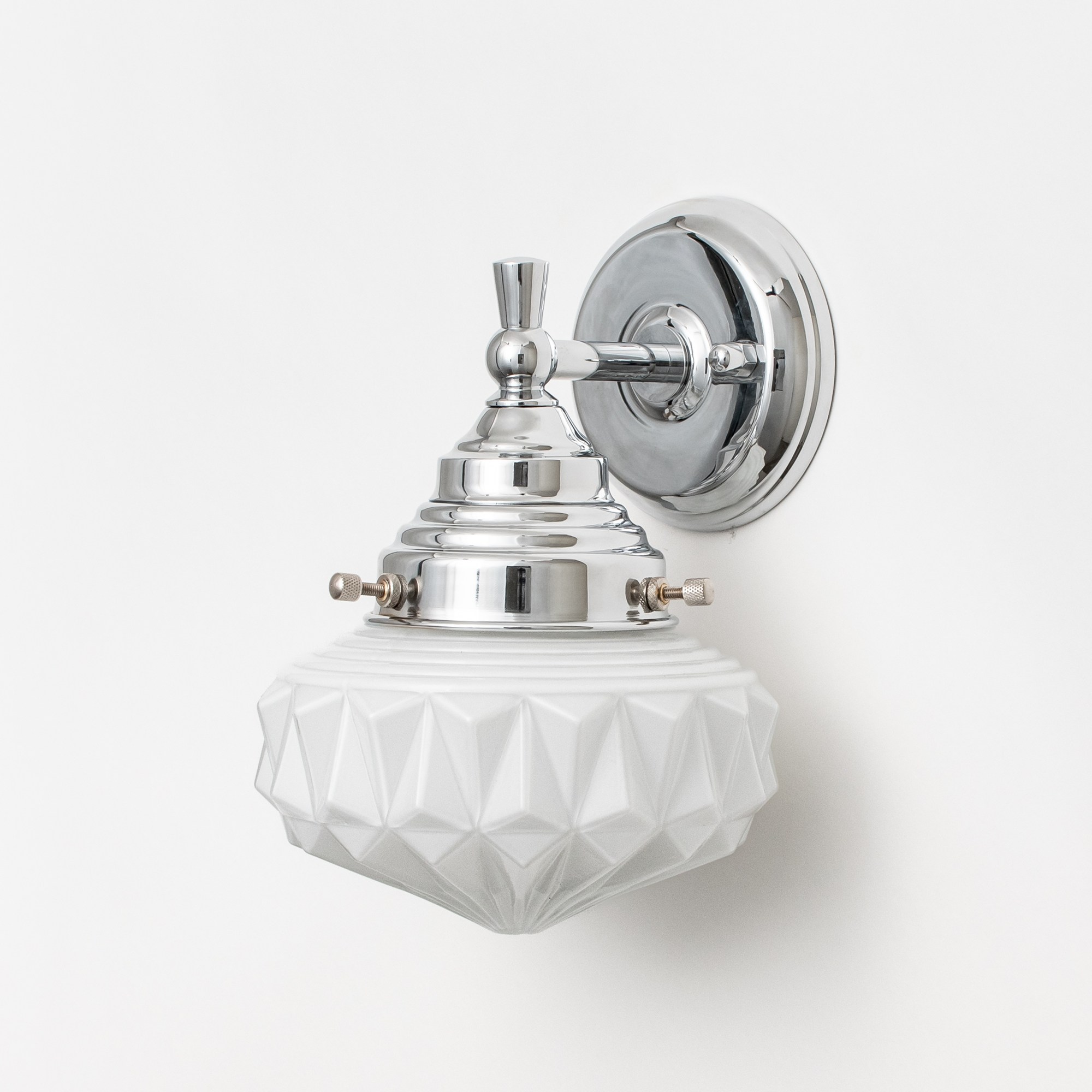 Dieser opalweiße Art-Déco-Glasschirm leuchtet wie ein ewiger Stern. Beachten Sie das komplizierte dekorative grafische Muster, das im Innenraum wie ein Diamant funkeln wird!