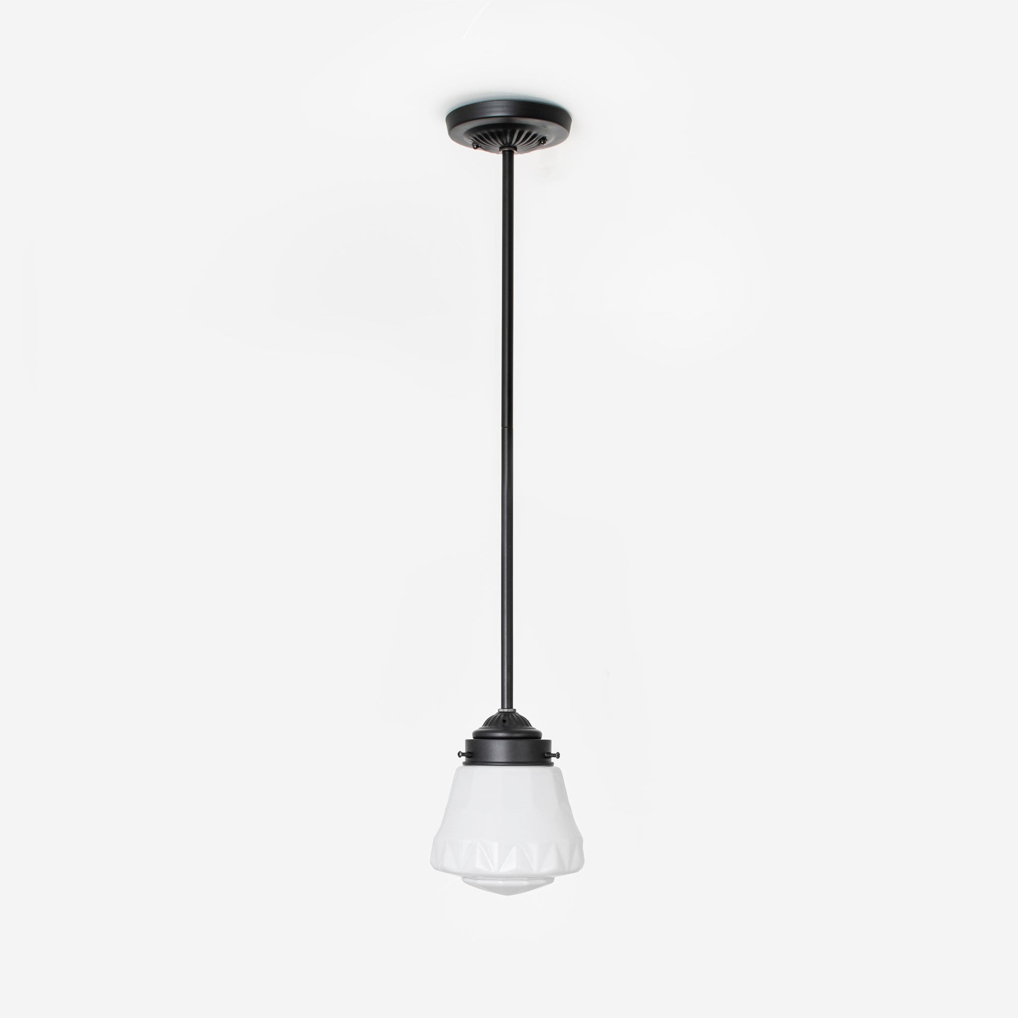 Diese Art-Déco-Form ist kühn und imposant. Die geometrischen Zacken und Bögen sind eine Referenz an die imposanten Gebäude der 1920er Jahre. Modern und expressionistisch. Opalweißes Glas.