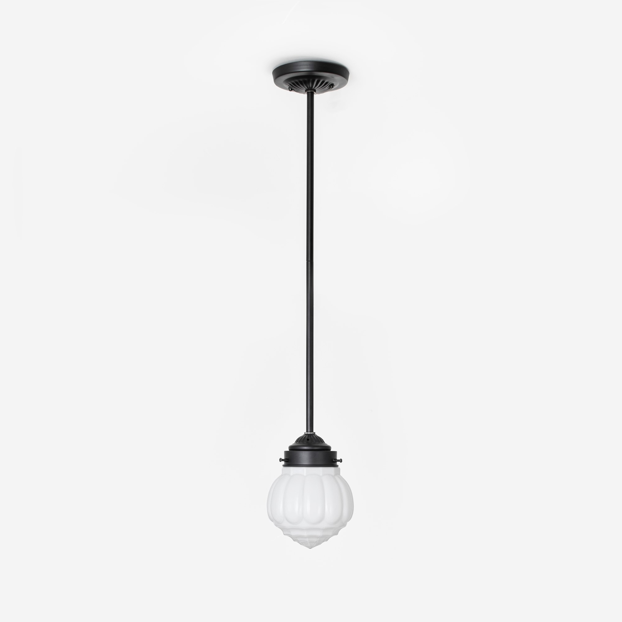 Dieser opalweiße Glasschirm mit runden Formen und grafischen Linien eignet sich perfekt für eine fantastische Innendekoration. Gemeinsam essen, genießen und anstoßen!