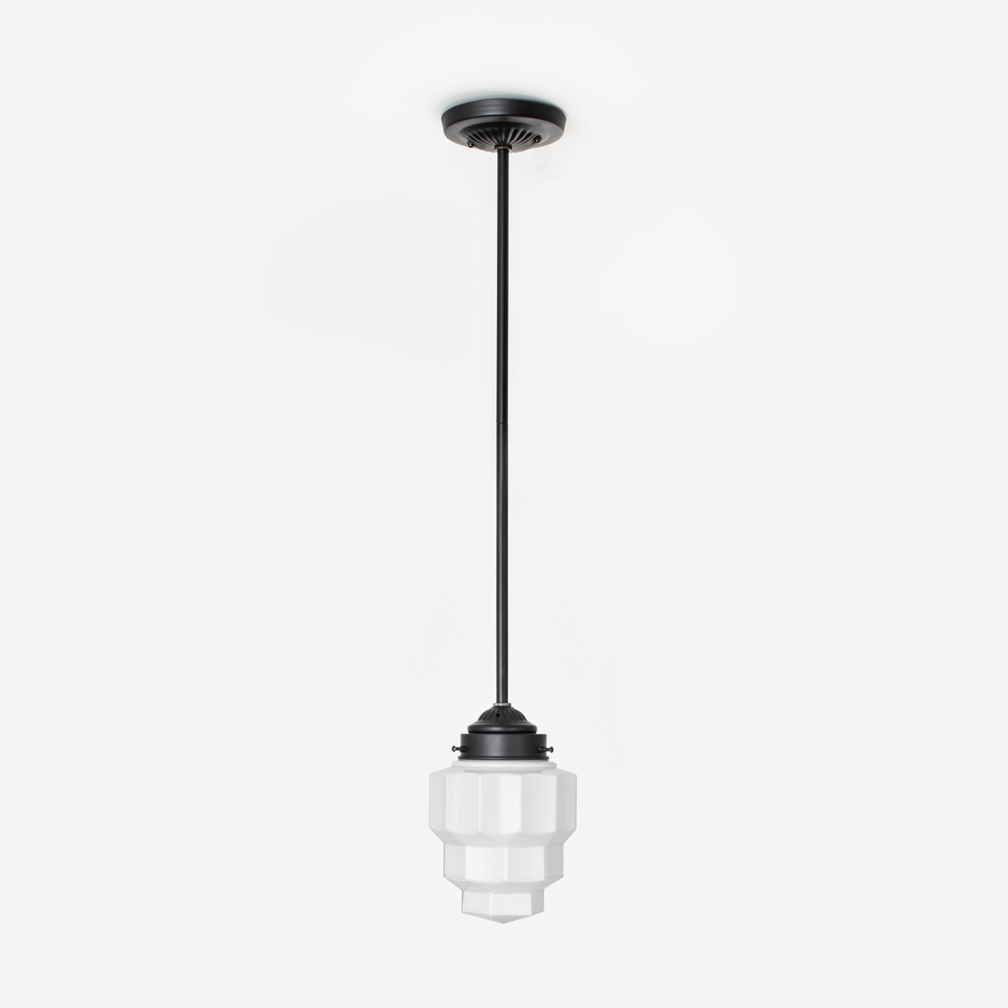 Spektakulärer, mundgeblasener Lampenschirm aus Art-Déco-Glas. Die Böden bestehen aus eckigen, geometrischen Formen. Opalweißes Glas.