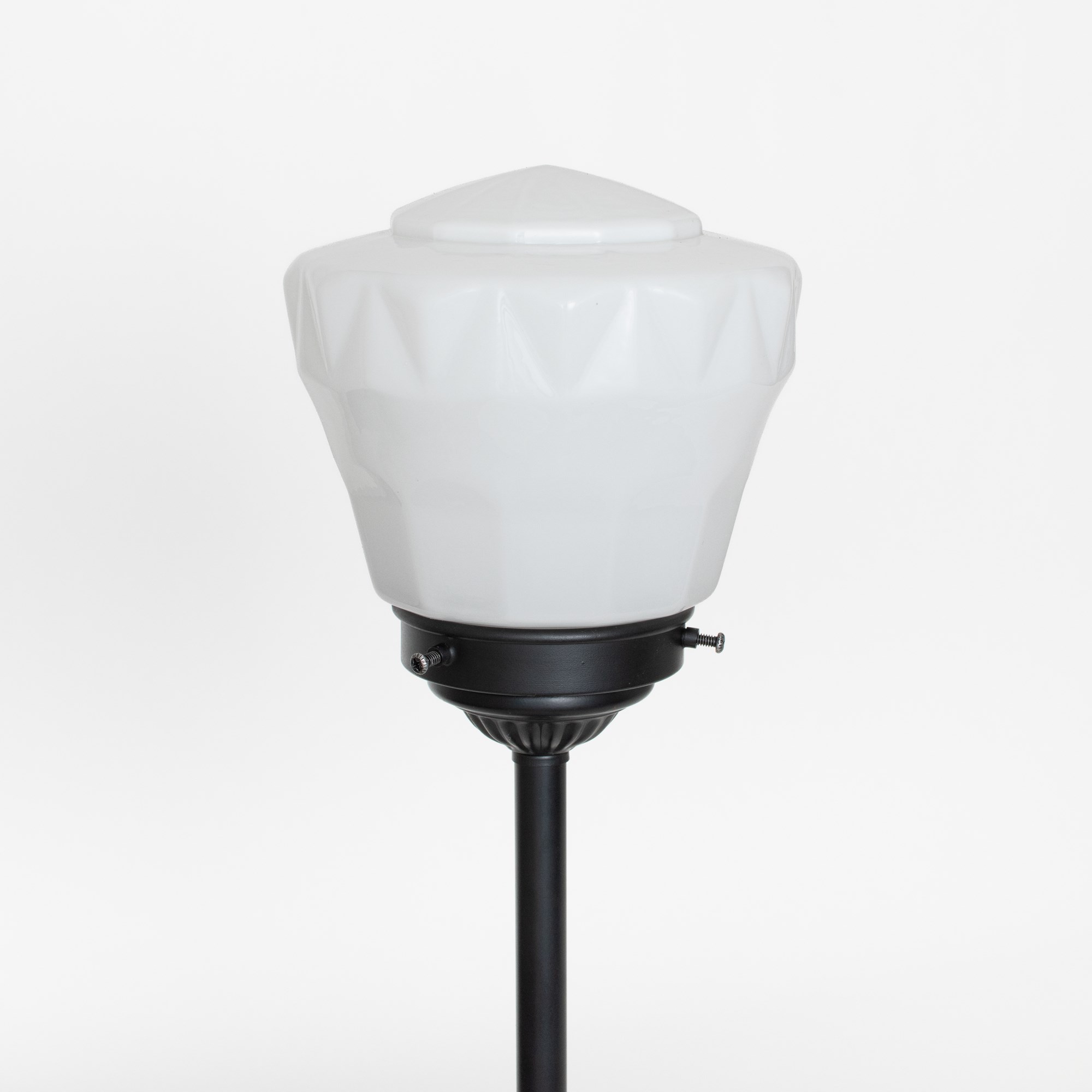 Diese Art-Déco-Form ist kühn und setzt ein Zeichen. Die geometrischen Muster aus Punkten und Bögen verweisen auf imposante Gebäude aus den 1920er Jahren. Modern und expressionistisch. Opalweißes Glas.