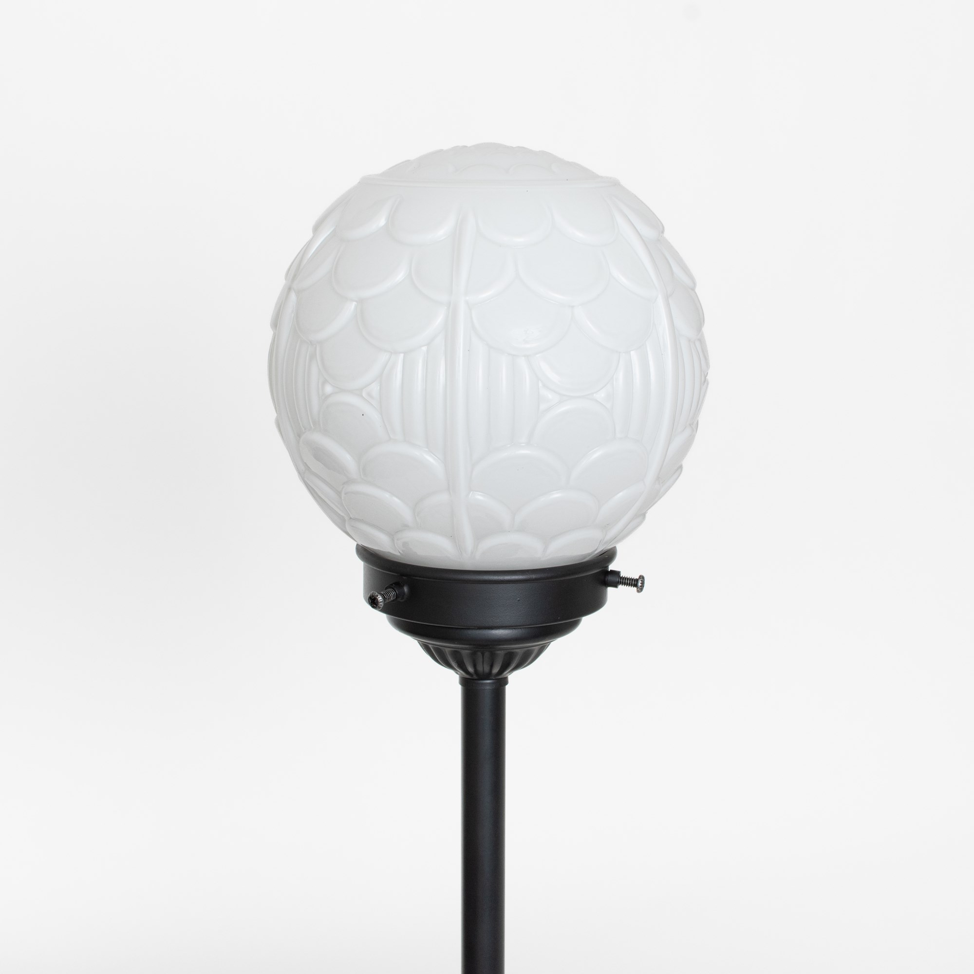 Eine Arkade aus kleinen Bögen wird als Arkatur bezeichnet und als dekoratives Motiv verwendet. Diese Motive sind häufig auf Stoffen und Tapeten zu sehen. So auch auf diesem fantastischen Schirm aus mundgeblasenem Glas in Opalweiß.