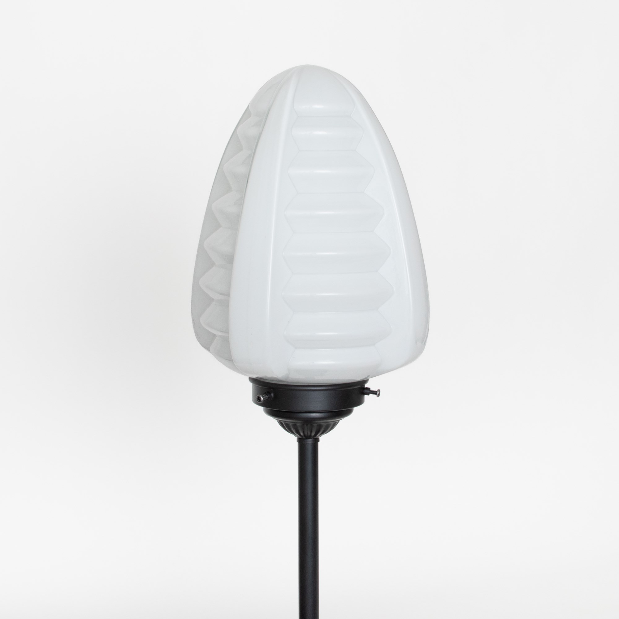 Die Parabelform ist ein häufig wiederkehrendes Element im Stil der Amsterdamer Schule. Sehen Sie hier den extravaganten parabolischen Glasschirm in Opalweiß, der zu beeindrucken verspricht.