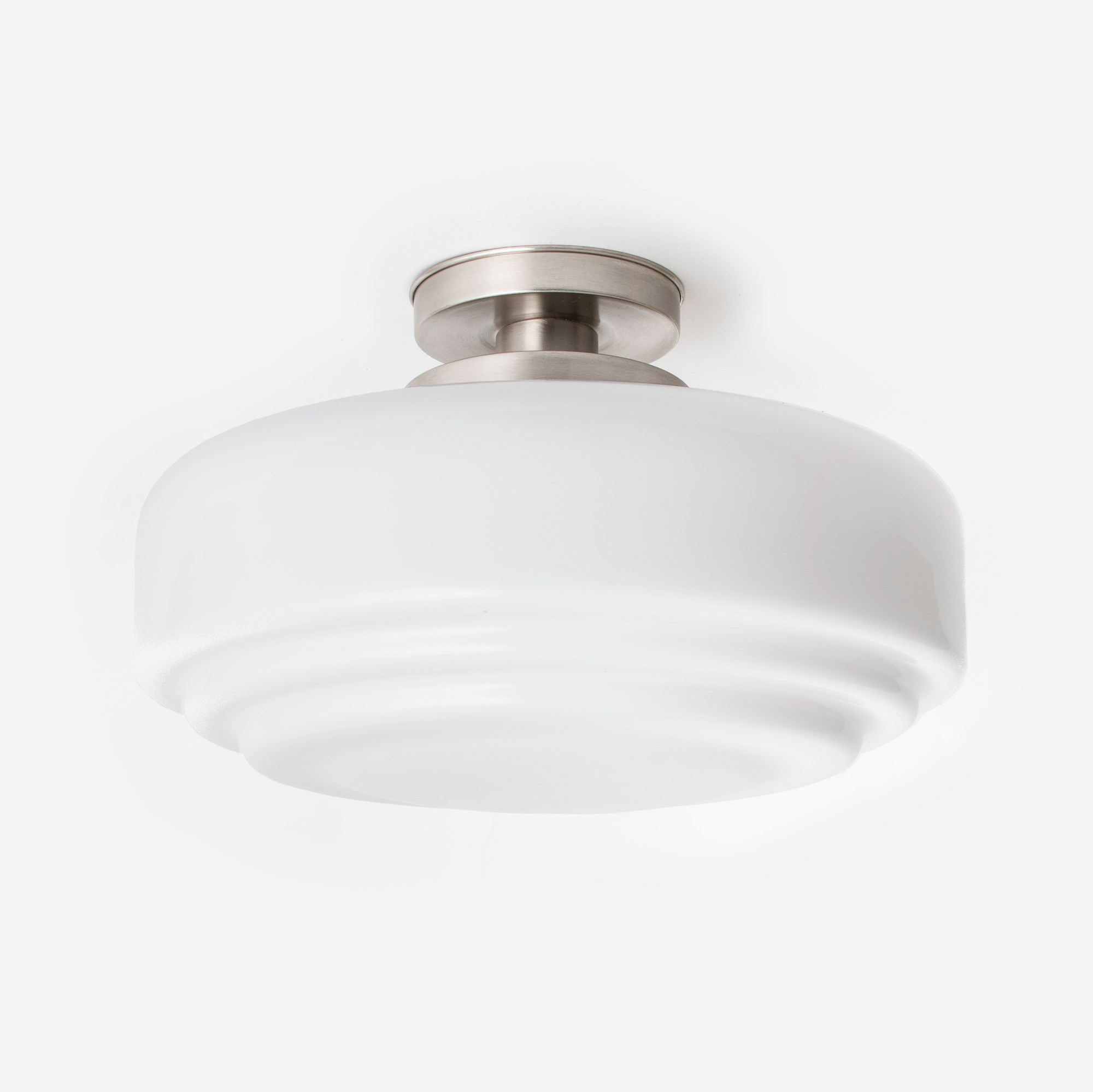 Ein horizontaler Lampenschirm aus Glas in einer geschichteten Form. Der Name der Lampe erinnert an den Architekten Frank Lloyd Wright (1867 - 1959). Sein Stil zeichnete sich durch die horizontale Konstruktion aus. Mundgeblasen aus opalweißem Glas.