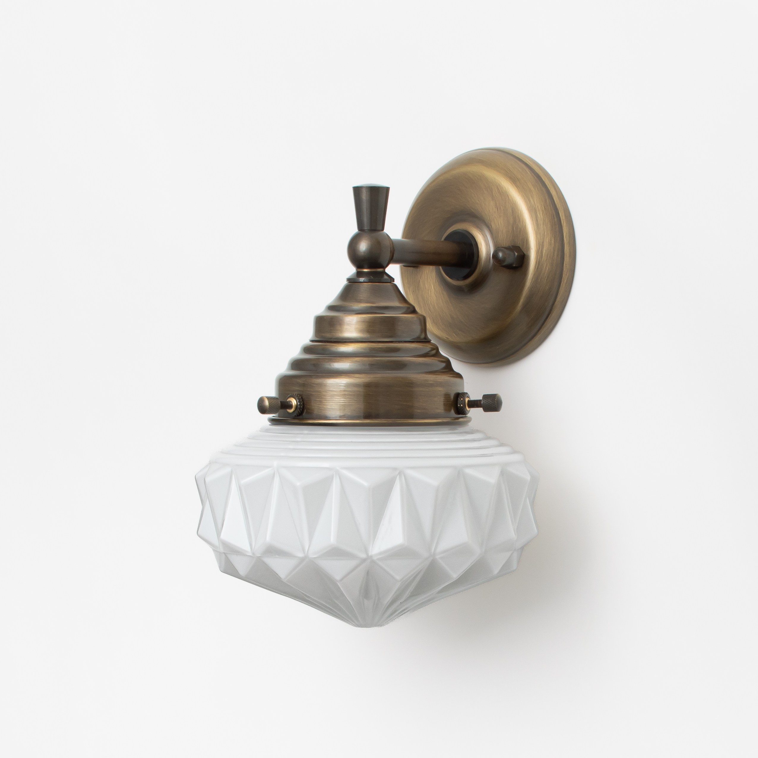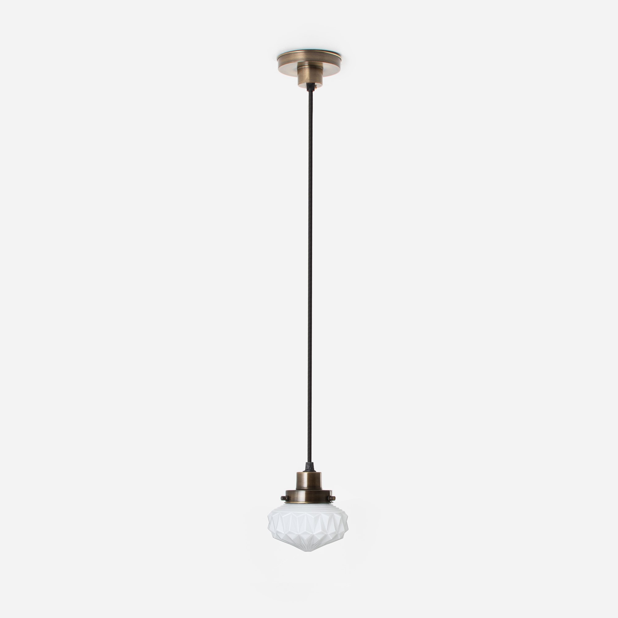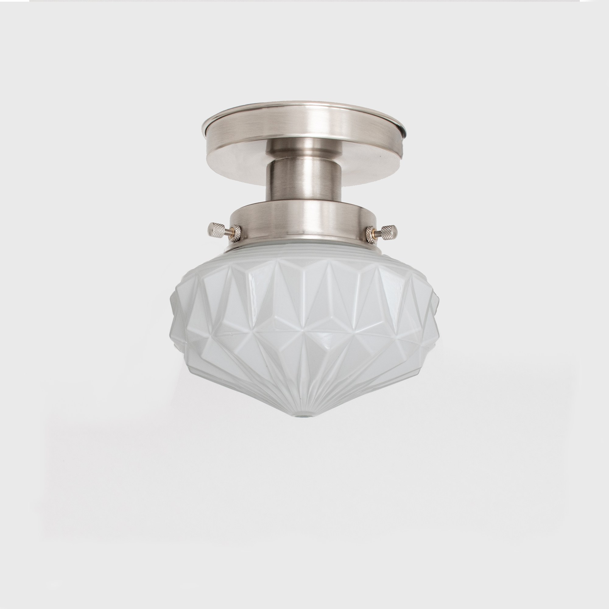 Dieser opalweiße Art-Déco-Glasschirm leuchtet wie ein ewiger Stern. Beachten Sie das komplizierte dekorative grafische Muster, das im Innenraum wie ein Diamant funkeln wird!