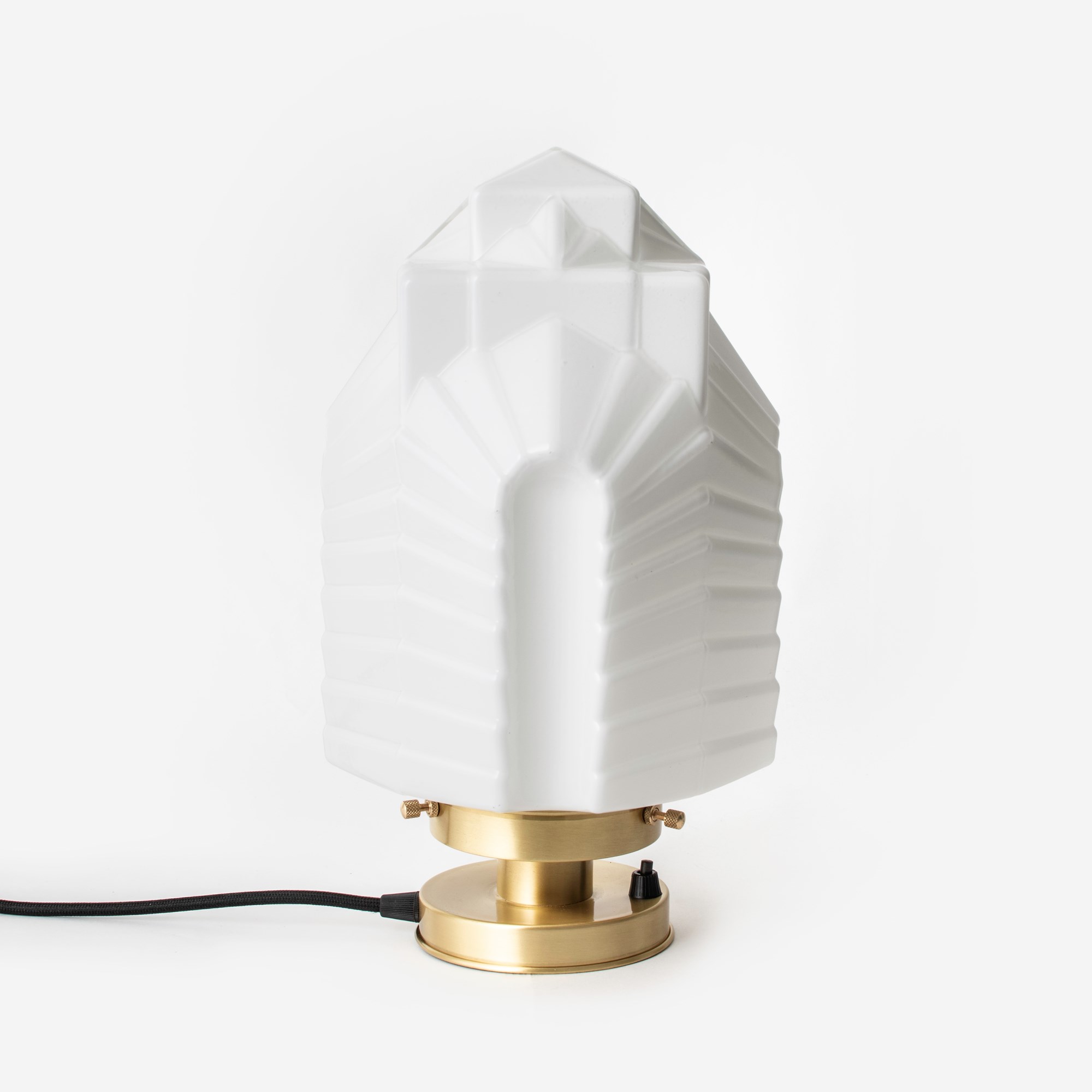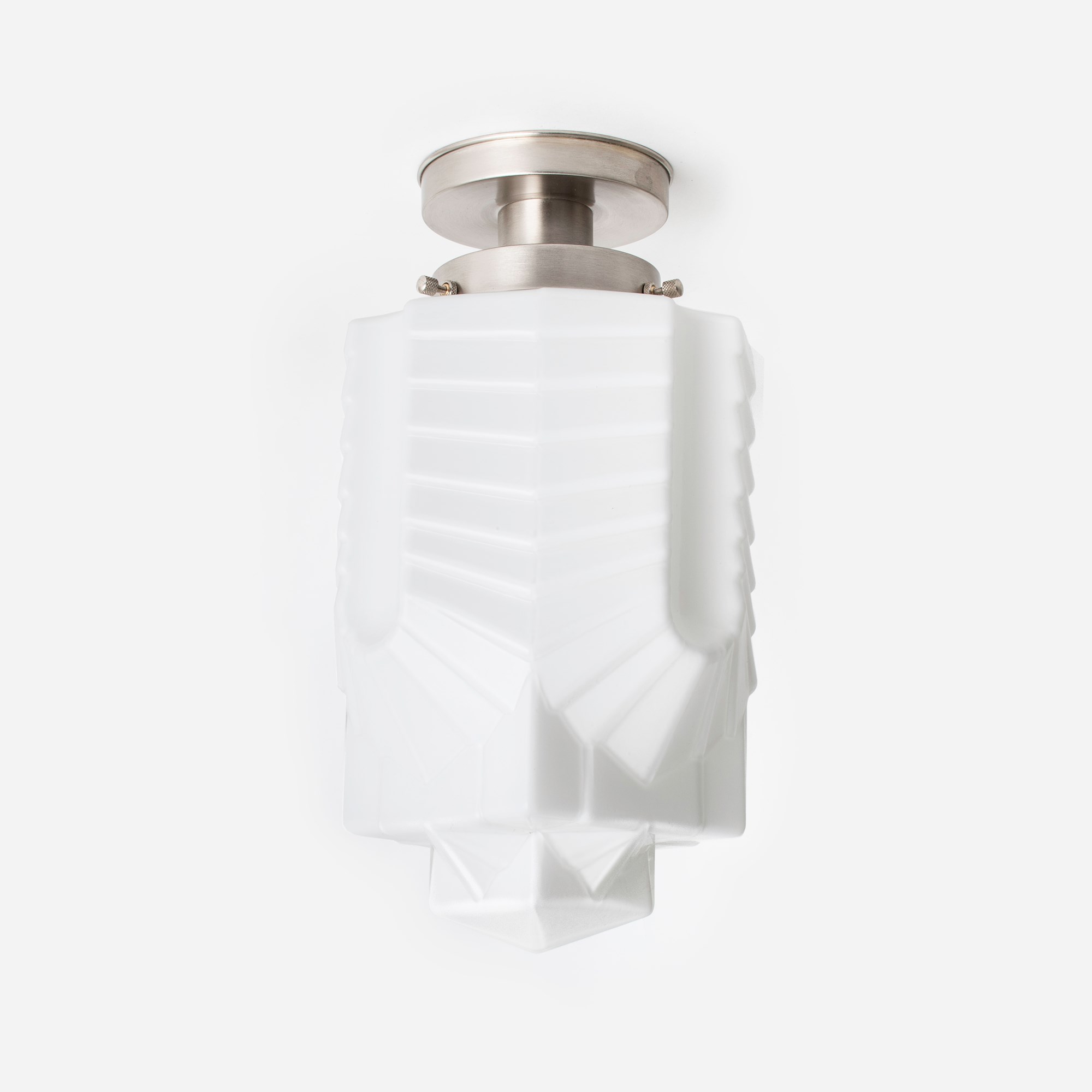 Ein ungewöhnlicher, expressionistischer Lampenschirm aus Glas. Dieses Modell weist außergewöhnliche Verzierungen auf. Mundgeblasen aus opalweißem Glas.