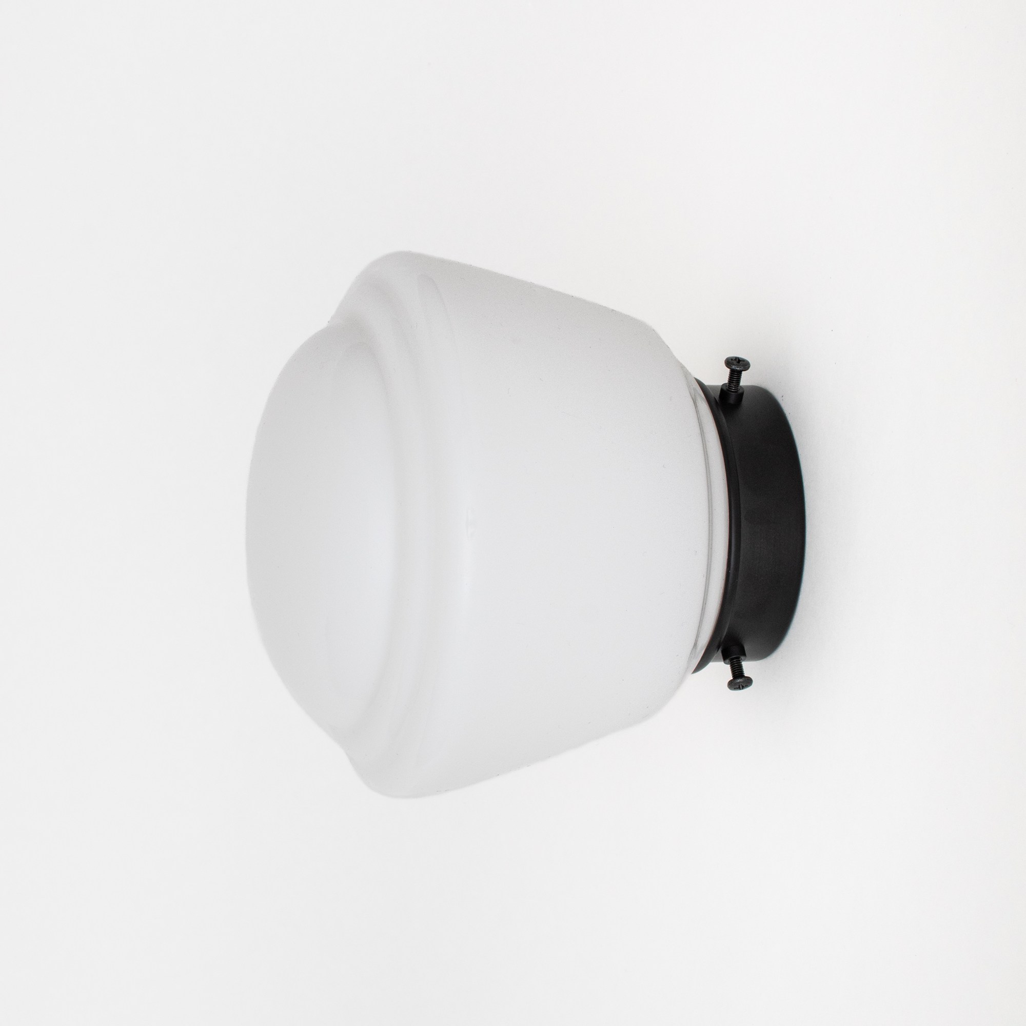 Ein konischer Lampenschirm aus Glas mit reißenden Riffeldetails und einem charmanten "Knopf" an der Unterseite. Mundgeblasenes opalweißes Glas.