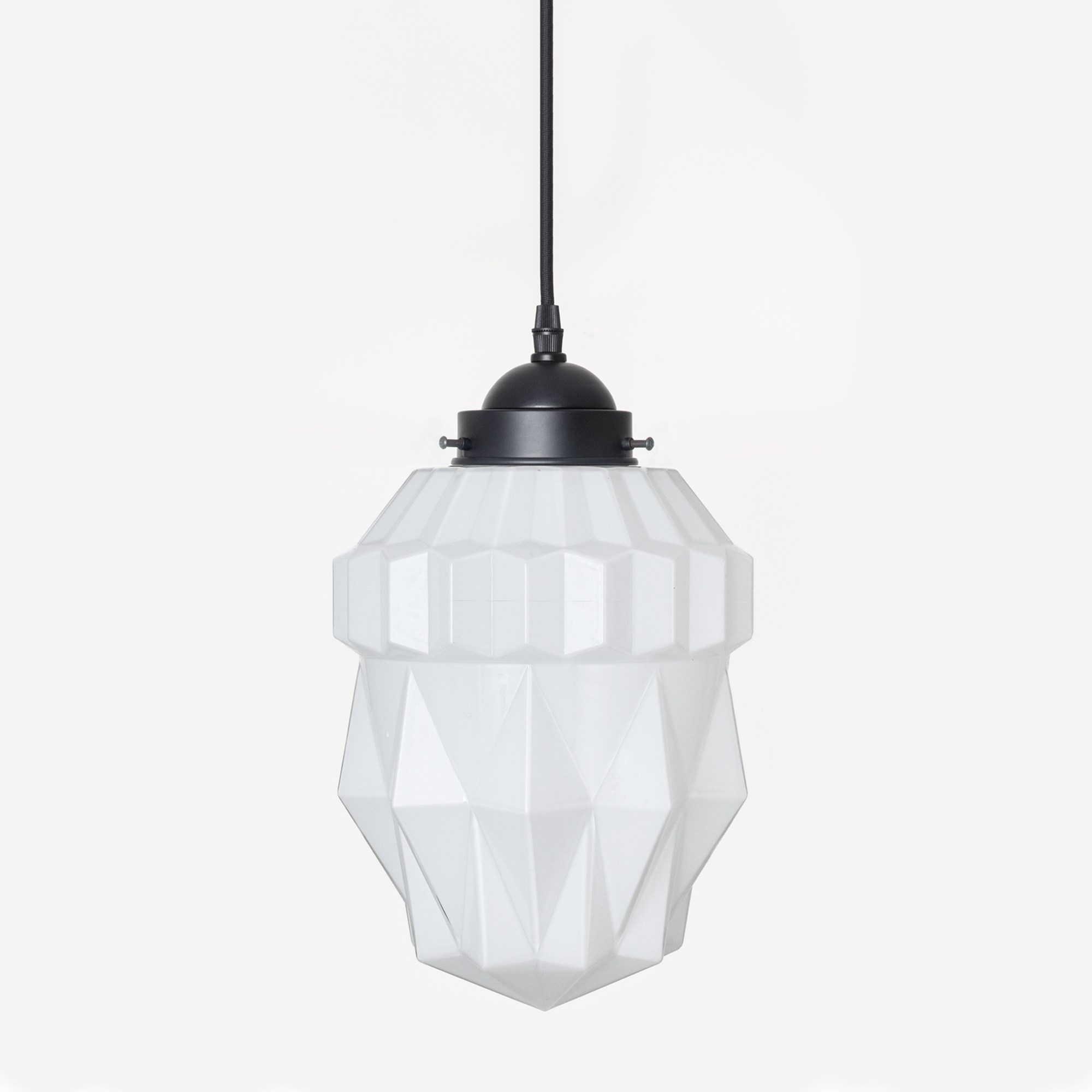 Dieser spektakuläre Glasschirm mit gewellten Winkeln funkelt und ist ganz in Harmonie. Ein Spitzenmodell aus opalweißem Glas.