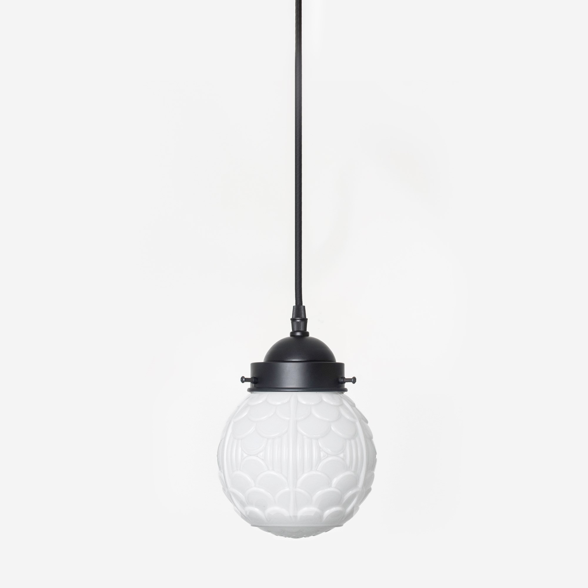 Eine Arkade aus kleinen Bögen wird als Arkatur bezeichnet und als dekoratives Motiv verwendet. Diese Motive sind häufig auf Stoffen und Tapeten zu sehen. So auch auf diesem fantastischen Schirm aus mundgeblasenem Glas in Opalweiß.