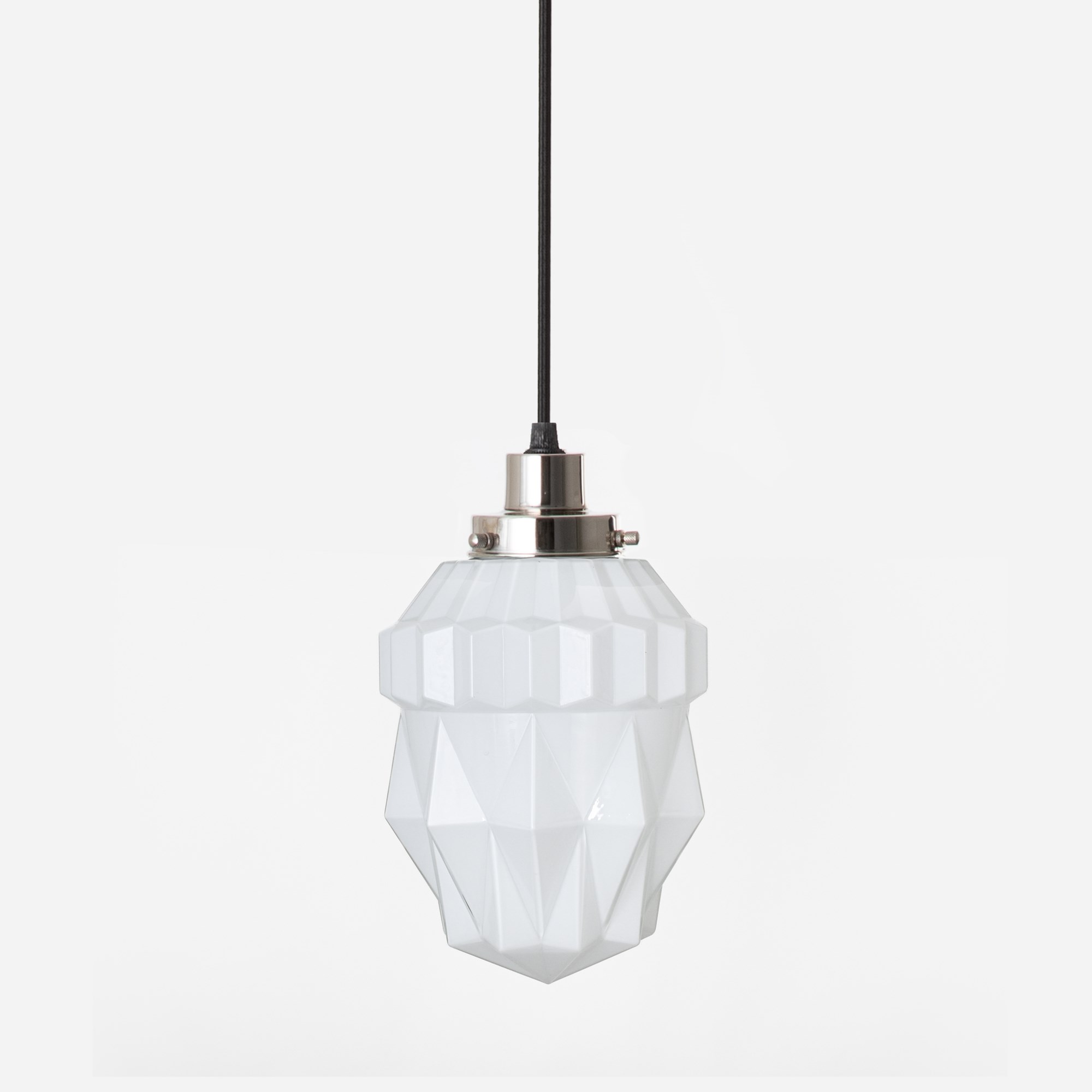 Dieser spektakuläre Glasschirm mit gewellten Winkeln funkelt und ist ganz in Harmonie. Ein Spitzenmodell aus opalweißem Glas.