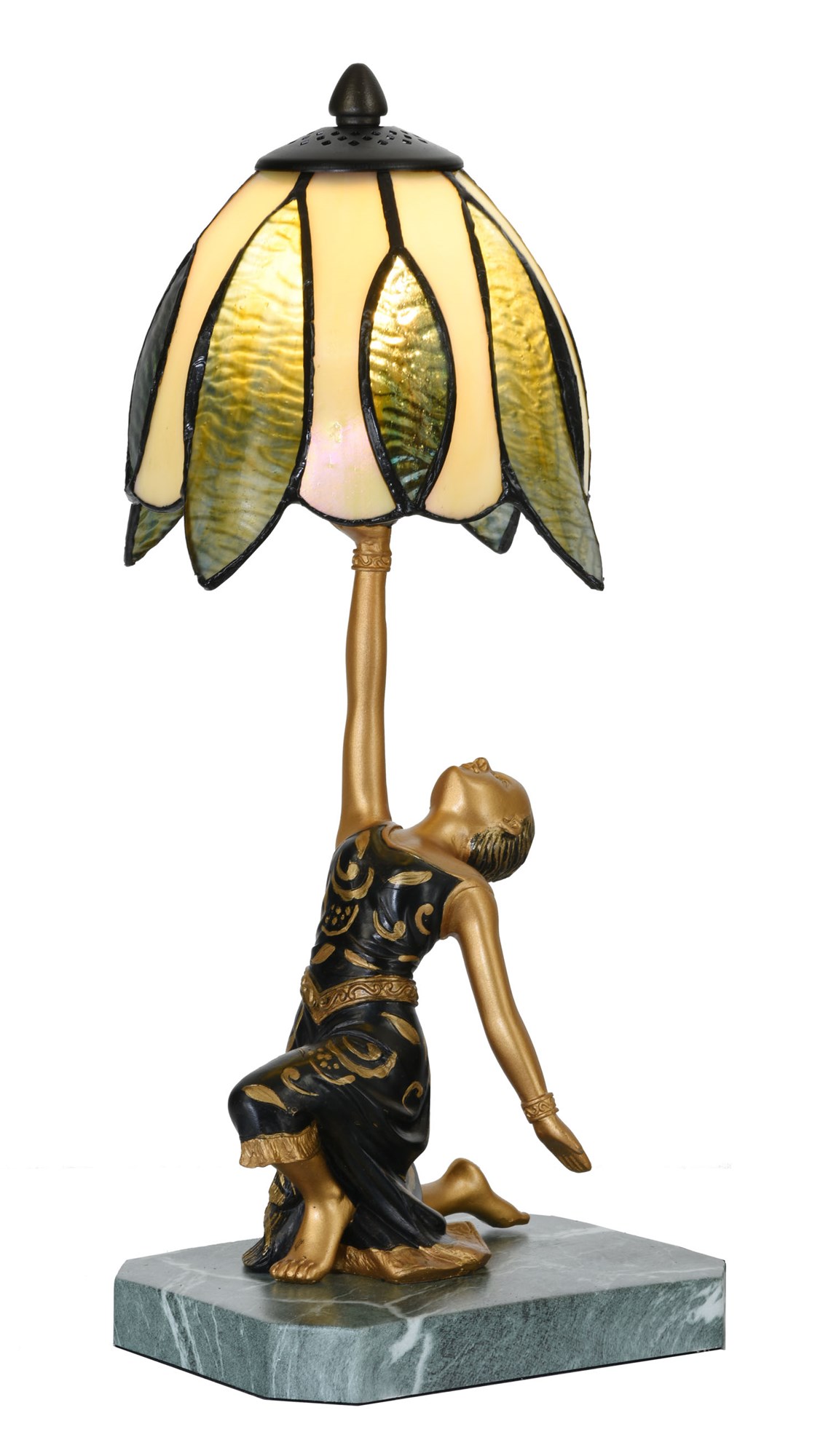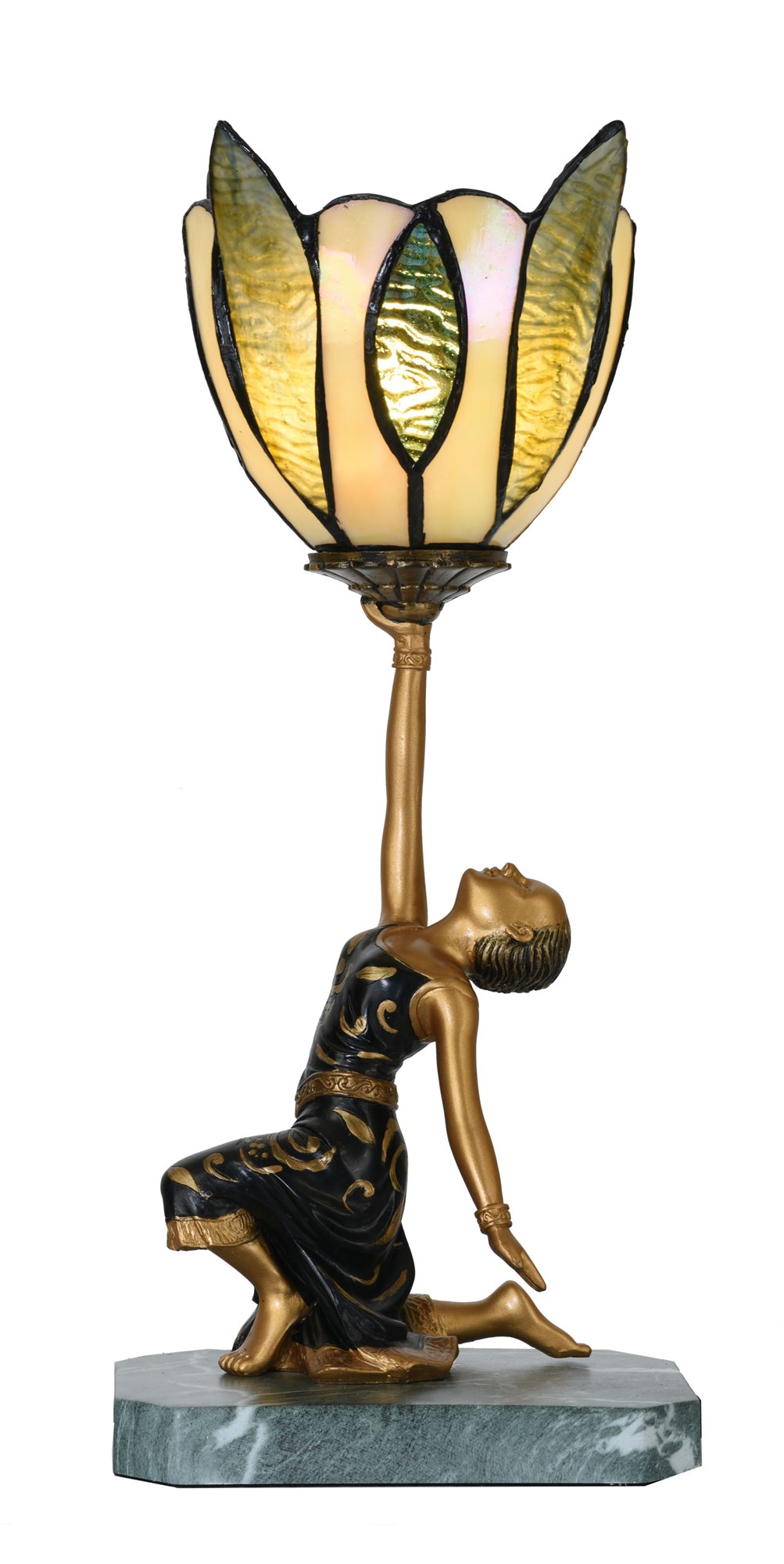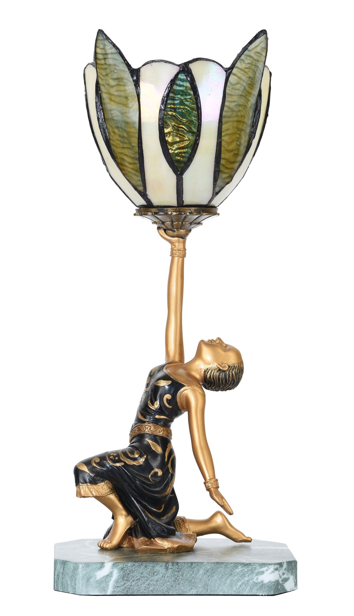 Die goldene Dame nimmt eine schöne Pose auf einem Sockel in grüner Marmoroptik ein. Ihr geschmeidiges schwarzes Kleid zeigt ein fantastisches patiniertes Design mit Blumen und Verzierungen. Beachten Sie auch den Saum des Kleides, den Gürtel und den Armreif. Der Look ist luxuriös, wie es sich für eine echte Art-Déco-Dame gehört.
