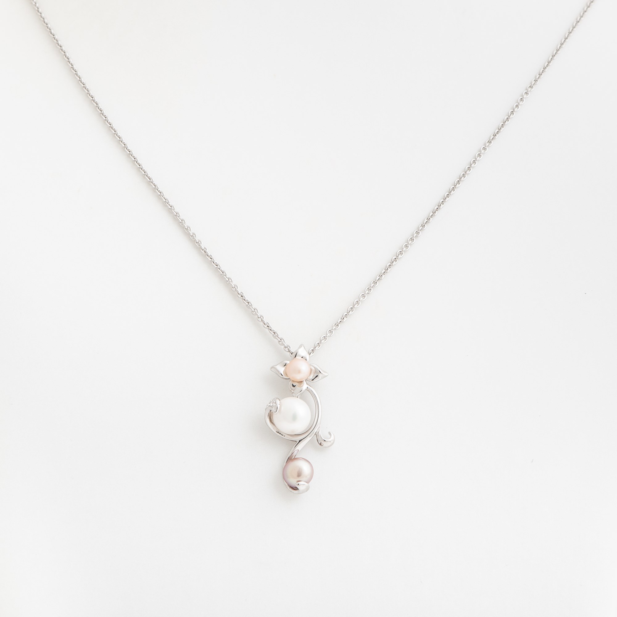 Die Perlen in diesem Collier sind wie Blütenknospen, die zu schönen Blumen sprießen. Die drei verschiedenen Farben der Süßwasserperlen, Koralle, Weiß und Lavendel, machen das Ganze noch verspielter. Sterling Silber.
