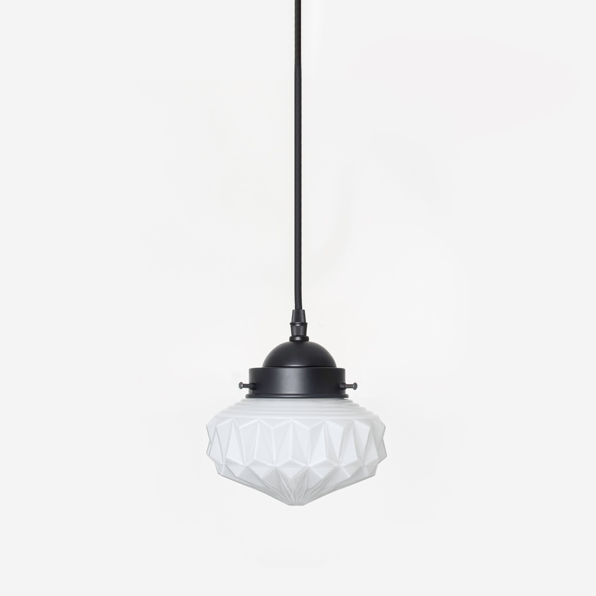 Dieser opalweiße Art-Déco-Glasschirm leuchtet wie ein ewiger Stern. Beachten Sie das komplizierte dekorative grafische Muster, das im Innenraum wie ein Diamant funkeln wird!