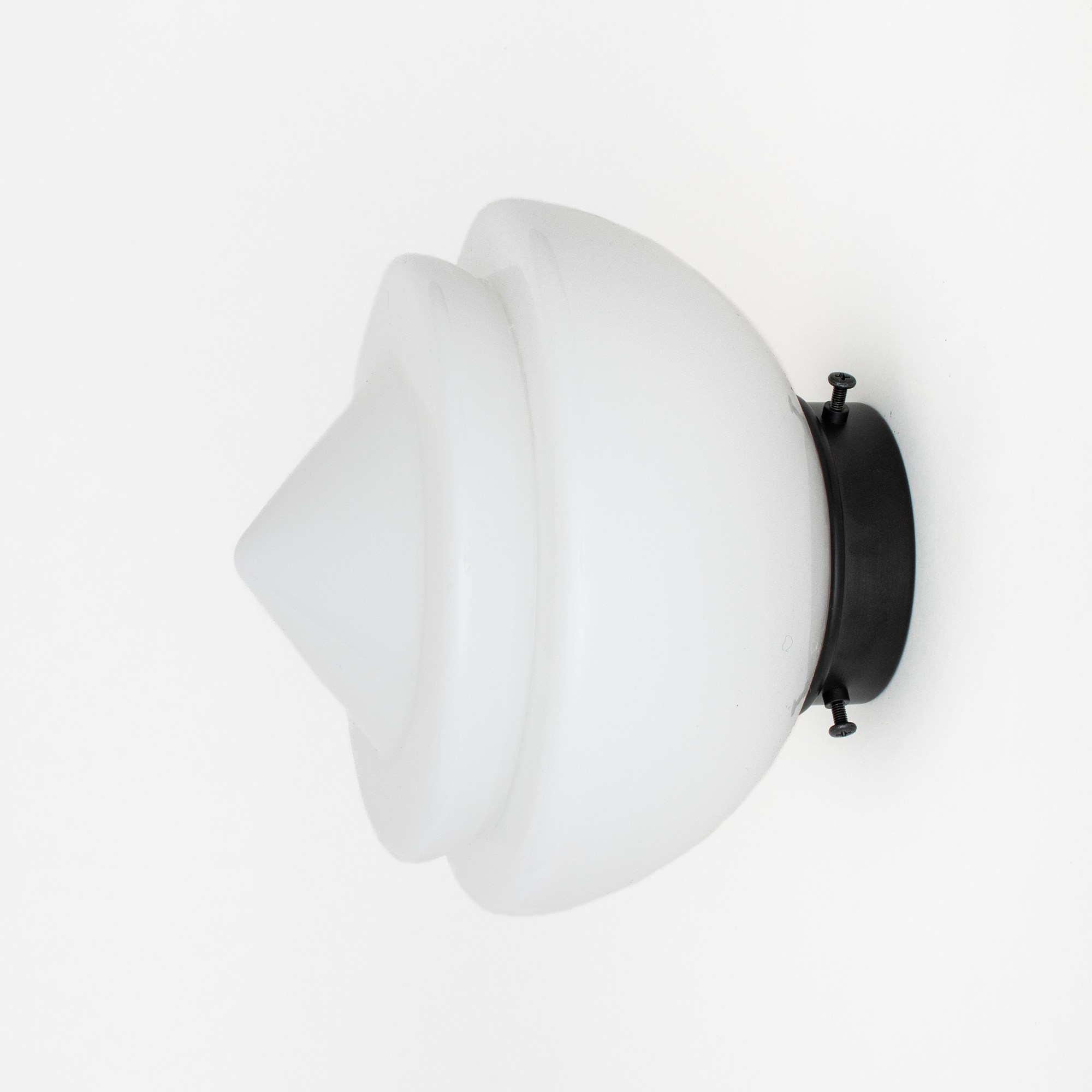 Elegant und würzig! Ein beliebter runder Glasschirm in einer geschichteten Form, die sich zu einem Punkt öffnet. Opalweißes Glas.