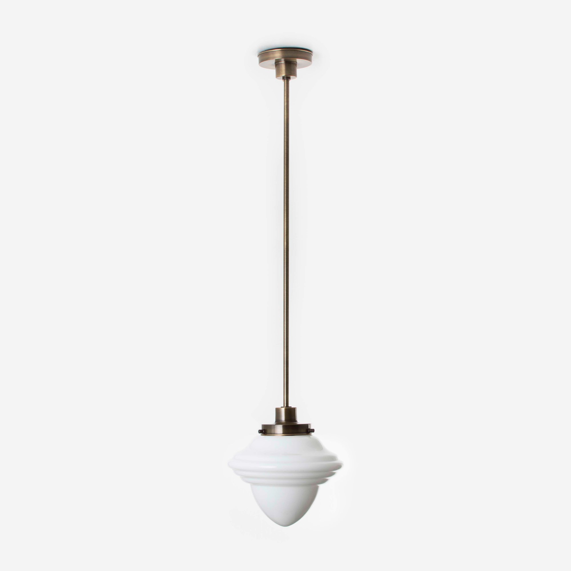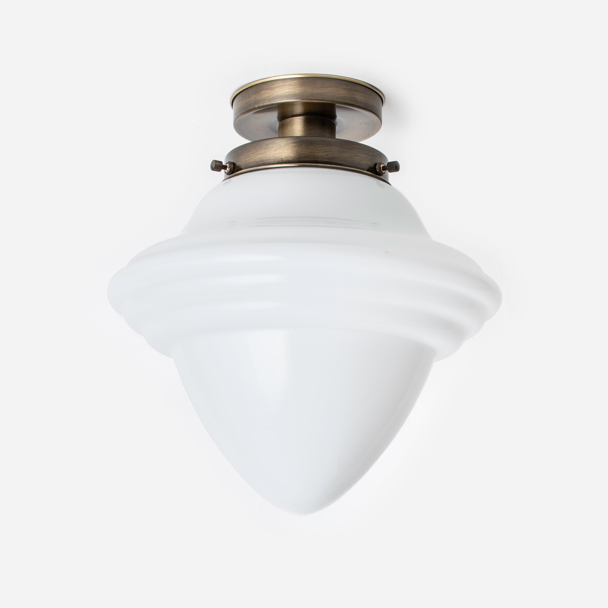Mundgeblasener Glasschirm in Form einer Eichel. Ein Klassiker des Art déco. Opalweißes Glas.